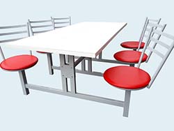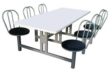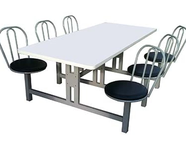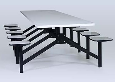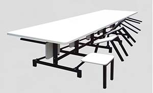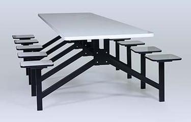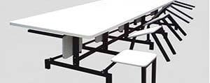 Mesas com assentos fixos ou retráteis.